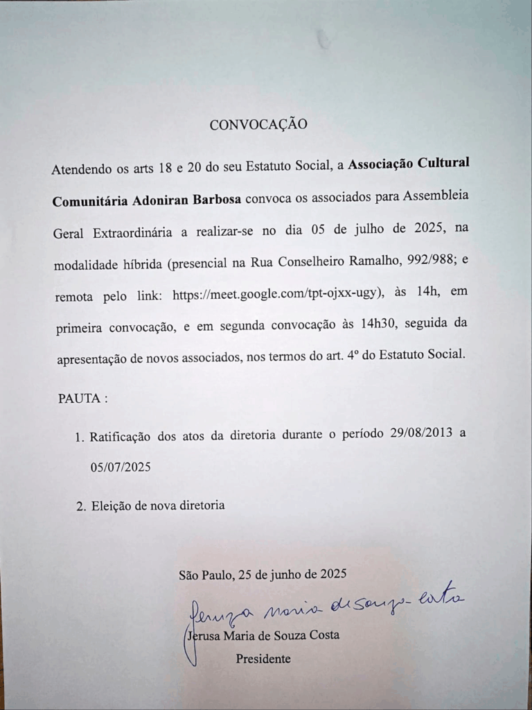 A Associação Cultural Comunitária Adoniran Barbosa convoca, através do edital abaixo, para assembleia geral ordinária a ser realizada no dia 5 de julho 2025, às 14h00, na sede da associação ou remotamente. A pauta da assembleia é a ratificação de atos da diretoria durante o período de 29 de agosto de 2013 a 5 de julho de 2025, além de eleição de uma nova diretoria.
