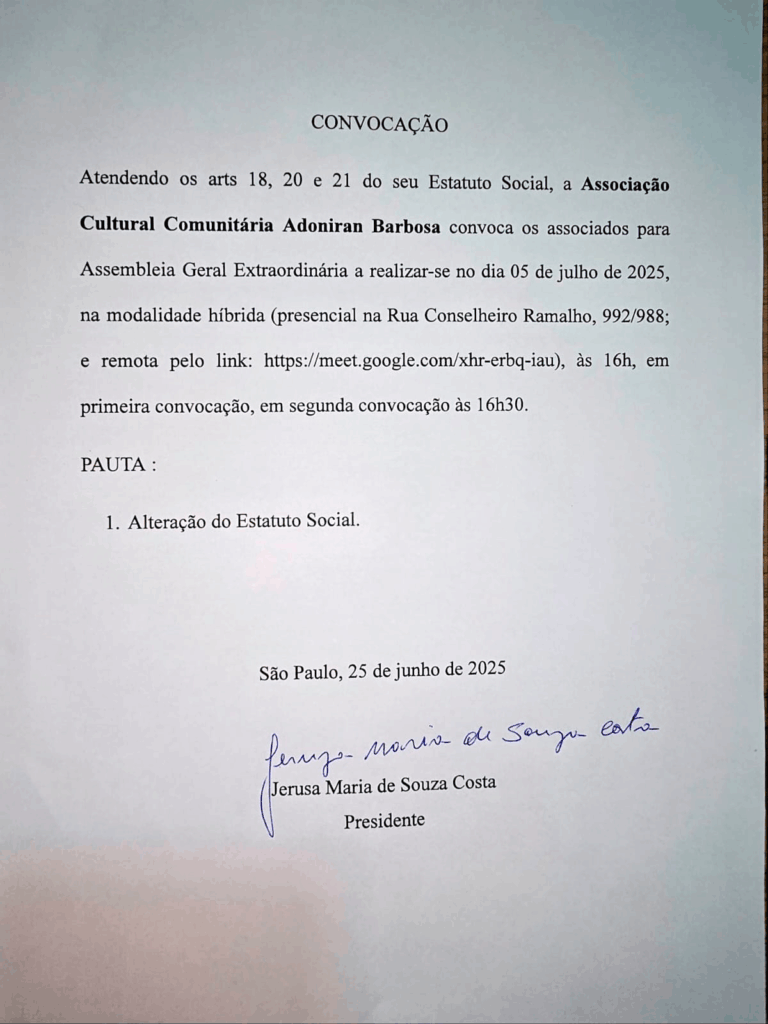 A Associação Cultural Comunitária Adoniran Barbosa convoca, através do edital abaixo, para assembleia geral ordinária a ser realizada no dia 5 de julho 2025, às 16h00, na sede da associação ou remotamente. A pauta é a alteração no estatuto social da entidade.