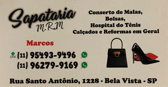 Serviços de sapataria em geral, conserto de malas, bolsas, hospital do tênis, calçados e reforma em geral.